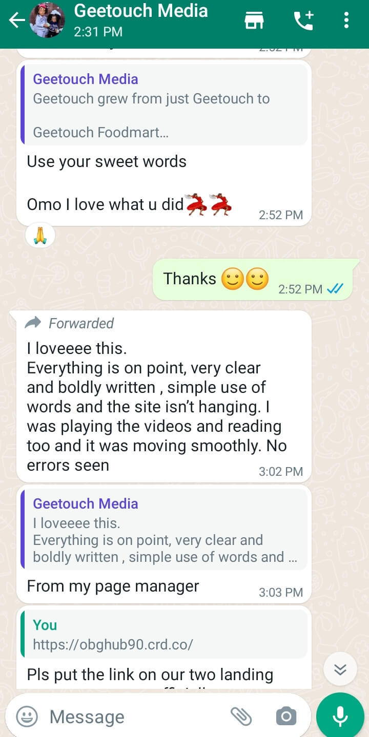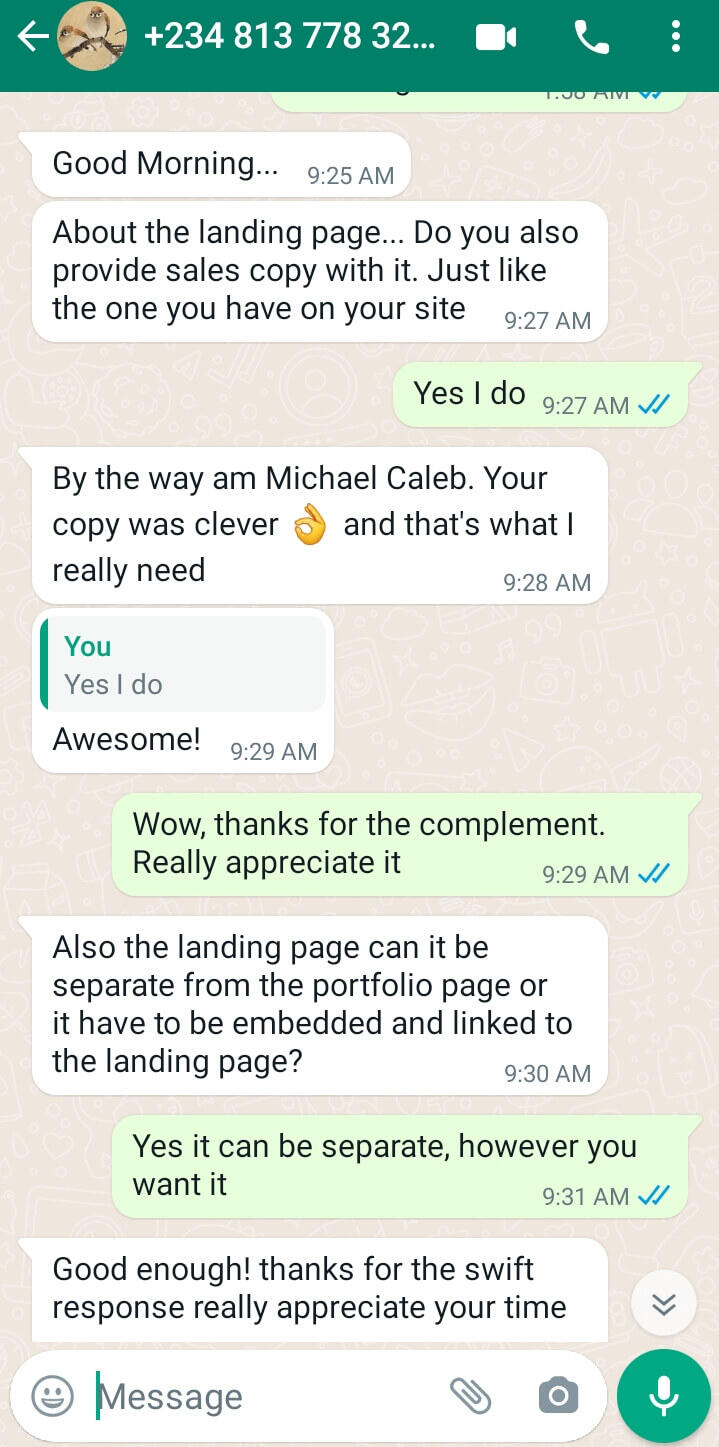 If you want to sell a ton-load of WHATEVER you sell, you need a copywriter, Period.But here is what you need to know first. Hiring a copywriter is no piece of cake. A good one can charge you as much as ₦100,000. It's crazy, I know.Now...Imagine your website or sales page written for a copywriter at ALMOST NO COST?Is that even possible?Yes... I'll season your one-page website with appetizing copy that sells - guaranteed -Just like what I did for my repeat client - Grace Omodunbi of Geetouch Media, see her reaction yourself: